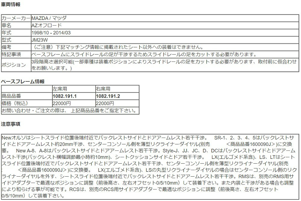 レカロ AZオフロード JM23W 純正ベースフレーム シートレール 右席用 1082.191.2 RECARO 内装パーツ